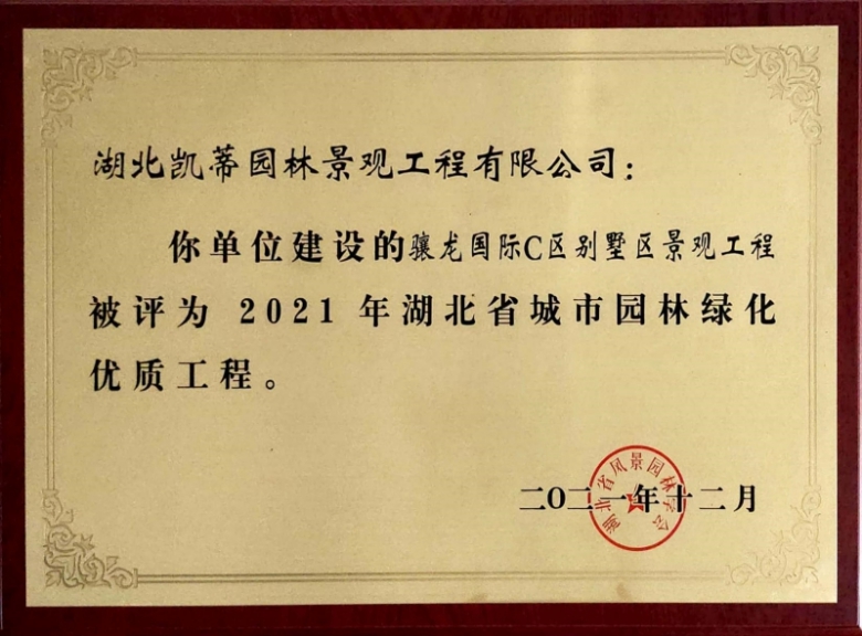 2012年12月,經湖北省風景園林學會專家評審委員會評定,“湖北凱蒂園林公司”負責施工的“驤龍國際C區別墅區景觀工程”被評選為“2021年湖北省城市園林綠化優質工程”
